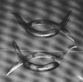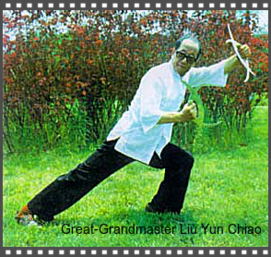 Most Deer Horn Knives seen in modern times have four points. This adds to the ability to trap the opponents weapon and disarm them. The fourth point was made re-curve in recent history by our Great-Grandmaster, Liu Yun Qiao. This allows for greater movement while avoiding cutting one's own arm. Great-Grandmaster Liu in describing Bagua weapons said that they are curved like Bagua itself. Two Deerhorn Knives form the symbol of the Wu Tang organization. The eight points represent the Ba Ji style, inside the circle are Yin and Yang representing Tai Ji, and together they symbolize Ba Gua.