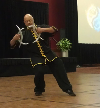 In this translation Lu Jiao means deer antlers, hence Deer Horn Knives. It has also been translated as Deer Antler Sabers, but this is more cumbersome to say. So while the most widely recognized Chinese name is Zi Wu Yuan Yang Yue and conveys much to the Chinese speaker, the favored English term is Deer Horn Knives. Other English names include Crescent Moon Knives and Mandarin Duck Blades.