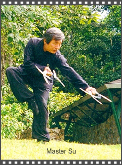 The Deer Horn Knives are a unique weapon originating from the Baguazhang or perhaps more correctly the Baguaquan School of Chinese Martial arts. Dong Hai Chuan, the founder, himself practiced this weapon. There are numerous stories of him killing large groups of armed men who had attacked him. Most of these are apocryphal and probably stem from the story on his original grave marker. It says there that once while travelling outside the city, Master Dong was attacked by many men with weapons. He defeated them all "moving like a hurricane.” As he did travel through rough country, it is likely that he would have defended himself from bandits using his Deer Horn Knives. Ordinary citizens would not have been able to get away with that, but as an instructor to the Imperial Guards, Master Dong was immune. The guards themselves were rumored to have carried small Deer Horn Knives concealed in their sleeves. Weapons weren’t allowed in the palace, but the guards may have used Bagua's hidden weapons to their advantage. The Deer Horn Knives are designed for use against multiple attackers, or any other type of weapon. There are numerous techniques for use against the spear, the staff, the saber and especially the sword. It has been said that the Deer Horn Knives are especially good at defeating the sword with their hooking and trapping techniques. Master Su Yu-Chang says they are the #1 weapon because they can break the energy of any other weapon, long or short. He also said they were for killing and that unlike other Bagua weapons, which may be better at locking and controlling, once the Deerhorn Knives come out, heads will roll. Deer Horn Knives come in various sizes. Large ones can be used to scale walls while small ones are used like throwing stars. There are also various configurations like recurved points and knives with either three or four points. Initially the knives had only three points one of which was slightly curved like a duck's head. It is said the duck's eye, a small indentation on one blade, could be laced with poison for extra killing power.