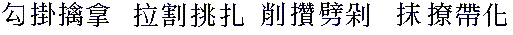 In action, the Deerhorn Knives have many techniques. As their shape is suggestive of the Yin Yang ball, so is their usage. While one is blocking, the other is attacking. While one traps, the other cuts. With blades in all directions, they are like the "claws of a dragon". There is a sixteen-keyword formula for the various techniques of the Deerhorn Knives. These include hooking, locking, cutting, pulling and chopping to name just a few. The full sixteen-character formula can be seen below.